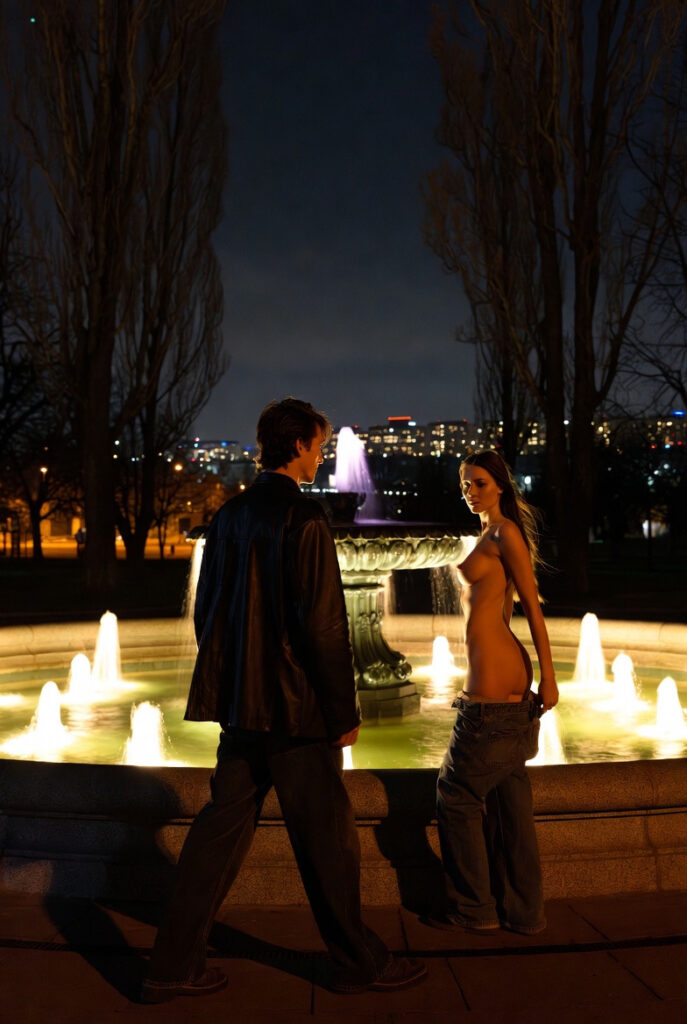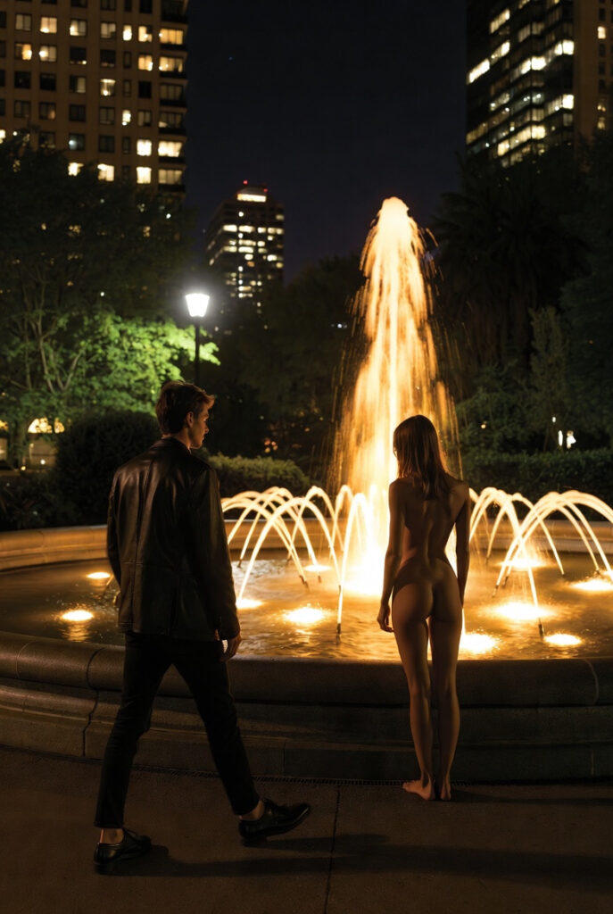 Then she stepped back, water streaming off her body like liquid gold, and disappeared into the shadowed paths beyond the plaza—leaving only ripples, wet footprints, and the memory of her skin burning against his palms.
