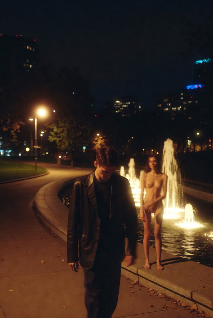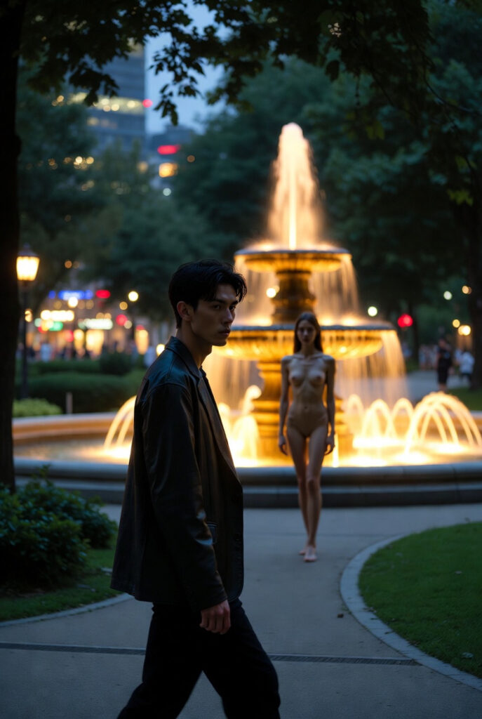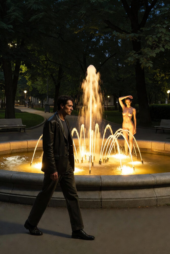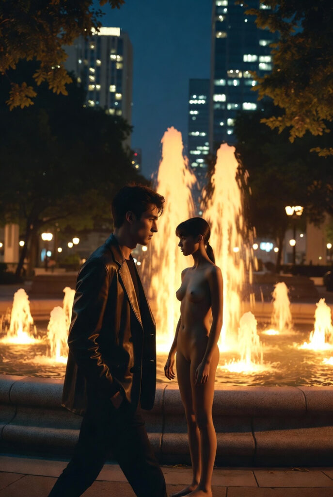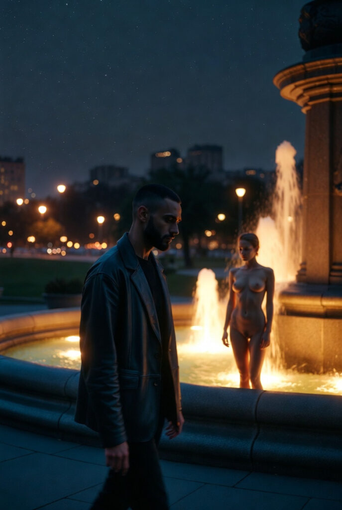 The city lights shimmered across the wet stone plaza as Alex cut through the late-night quiet, leather jacket creaking with each step. The central fountain glowed like liquid fire—cascading water illuminated from beneath, throwing golden ripples across the empty benches and dark trees.
