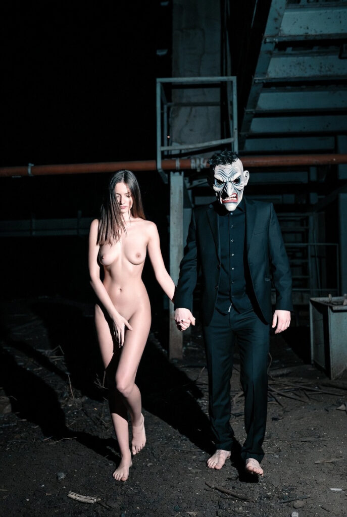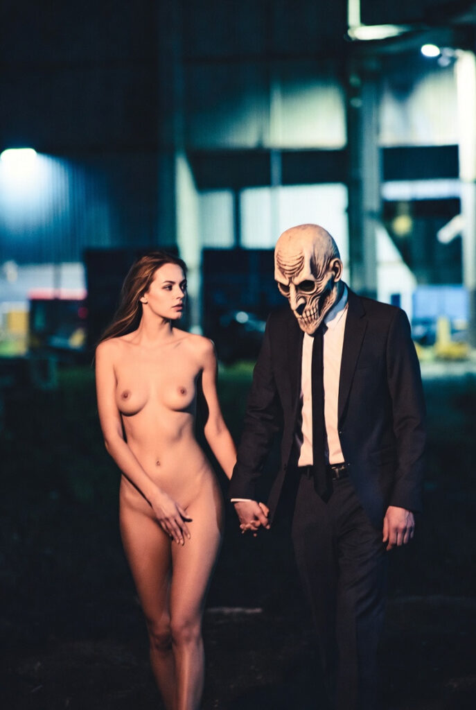 The mask was bone-white porcelain, sculpted into a grinning skull with deep hollow eyes. No mouth opening. No way to read anything beyond the tilt of his head. The black suit beneath it looked too expensive for this rotting place—tailored wool, crisp white shirt, silk tie the color of dried blood. He hadn’t spoken since he’d found her waiting at the rusted side door forty minutes earlier. He hadn’t needed to.