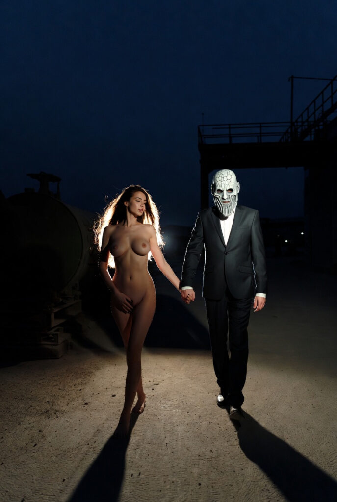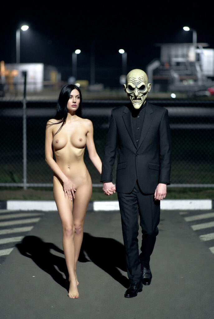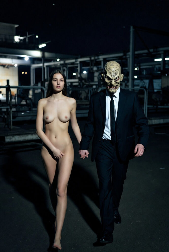 She walked barefoot across the cracked concrete, completely naked, skin prickling in the damp night air. Moonlight sliced through broken skylights and painted silver streaks across her breasts, her hips, the soft curve of her stomach. Every step made her aware of her own exposure, the way her thighs brushed together, the cool draft that teased between her legs.