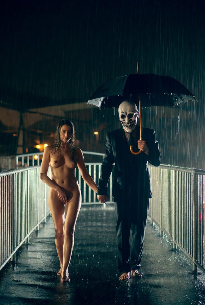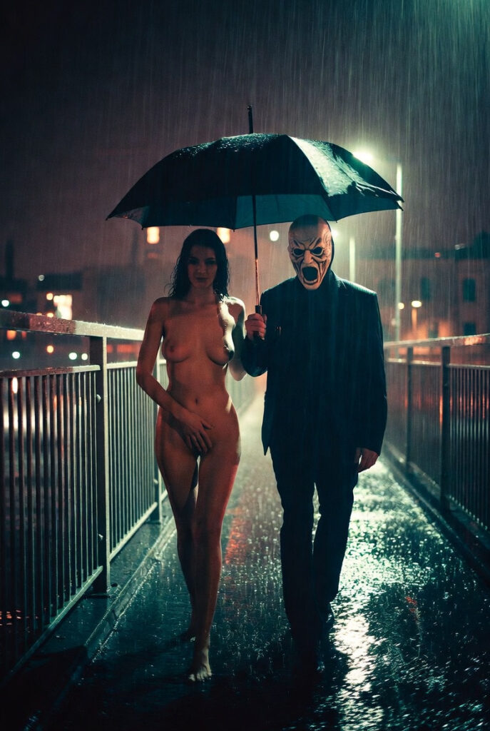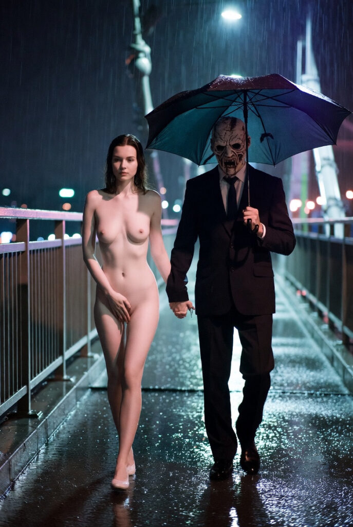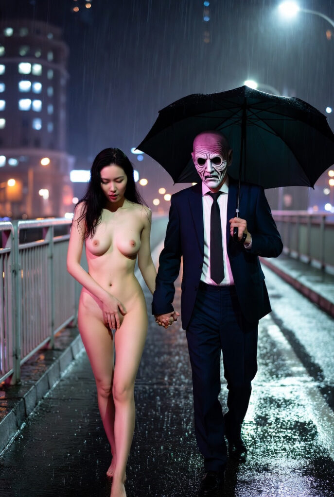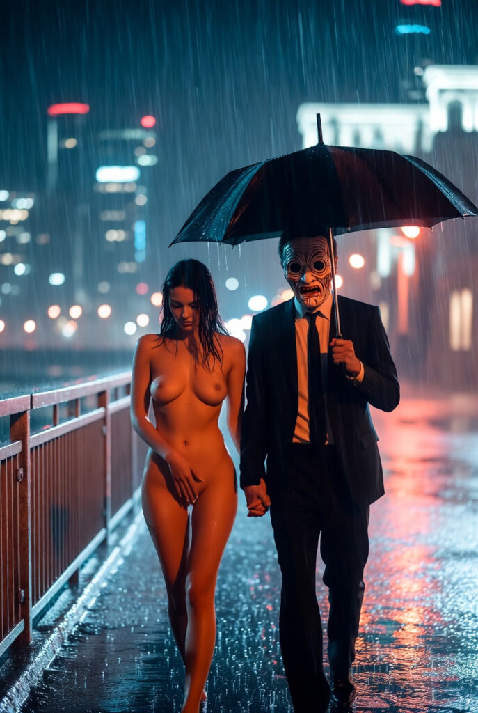 The rain hammered the city bridge in relentless sheets, turning the night into a glistening black mirror. Beneath the single green umbrella, Elena walked naked, her skin prickling with cold and something far more dangerous.