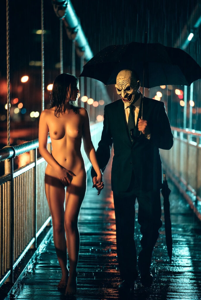 His gloved hand clasped hers—firm, possessive, the only point of warmth in the downpour. The man in the black suit and pale, grotesque mask never spoke. He didn’t need to. The porcelain features leered forward, hollow eyes fixed on her as though she were the only real thing left in the world.